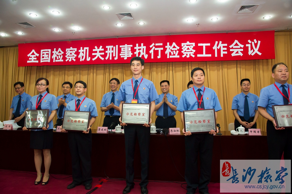 5月28日,最高人民检察院在北京召开全国检察机关刑事执行检察工作会议暨“全国示范检察室”授牌仪式。长沙市星城地区检察院驻省女子监狱检察室被授予“全国示范检察室”称号,最高人民检察院检察长曹建明亲自为星城地区检察院授牌。这是最高人民检察院对检察机关派驻监管场所授予的最高荣誉,全国2000多个派驻检察室,本次获此殊荣的检察机关全国仅11个。也是该院继获得“全国先进基层检察院”、“全国检察机关监所派出检察工作先进集体”、“全国减刑假释暂予监外执行专项检察先进集体”等荣誉称号之后,获最高人民检察院授予的又一全国荣誉。