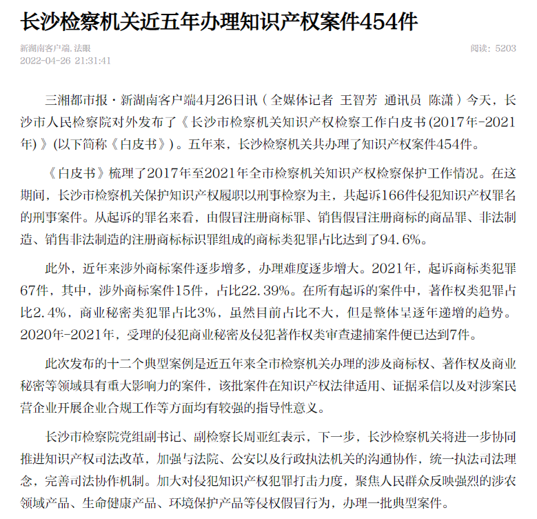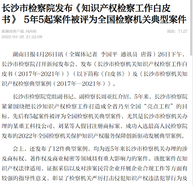 召开长沙检察知识产权司法保护状况新闻发布会,向社会发布《长沙市检察机关知识产权检察工作白皮书(2017年-2021年)》及《长沙市检察机关知识产权检察典型案例(2017年-2021年)》。