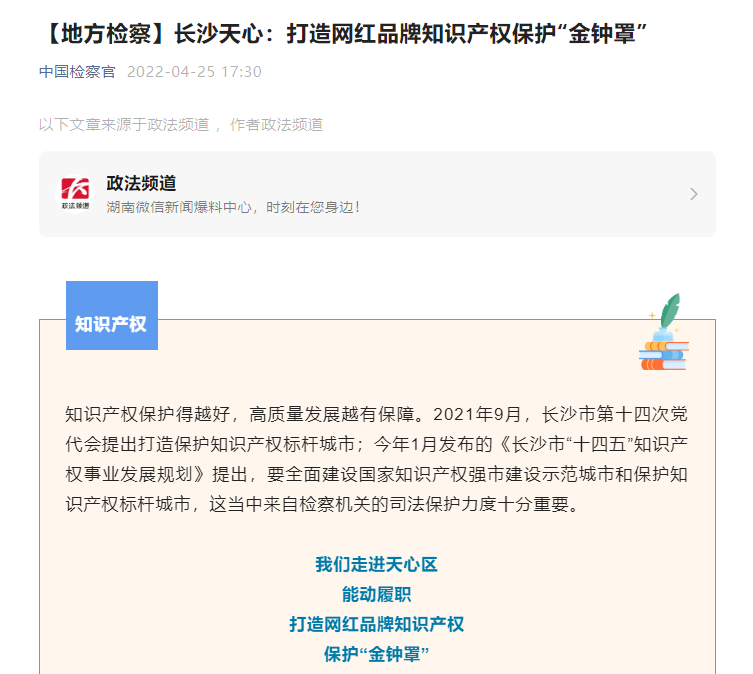 从4月21日至4月26日,长沙检察机关联合长沙政法频道推出“服务经济发展,护航创新驱动”为主题的“长检匠心”系列节目,分别以《对焦中非贸易,保护跨国交易知识产权》(雨花区)、《擦亮城市名片,保护食品安全》(天心区)、《护航自贸区经济发展,保护商业秘密》(长沙县)、《助力企业发展,服务智能制造》(岳麓区)、《加强文化领域知识产权保护,保护数字媒体艺术创新》(开福区)和《加强种业知识产权保护,确保粮食安全》(芙蓉区)共6个专题,对全市6个基层院相关工作开展情况进行特别报道,充分展现了长沙市检察机关贯彻落实“强省会”战略,助力知识产权标杆城市建设的担当。