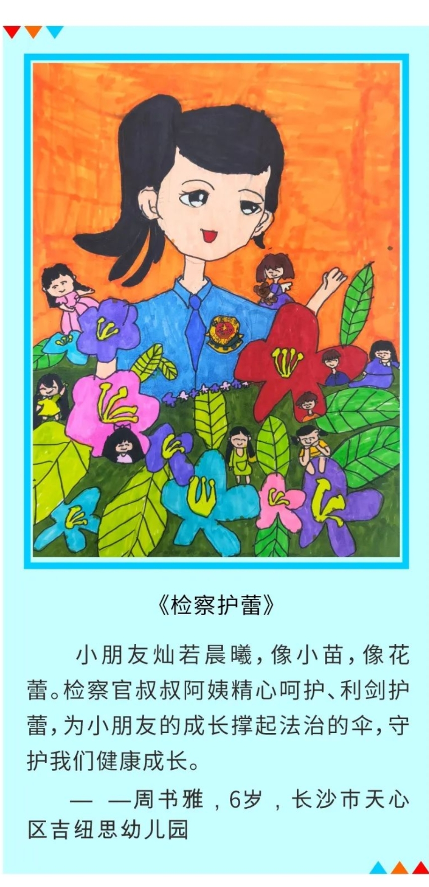 天心区检察院开展“以法为名,保护少年的你”主题绘画作品征集活动,邀请孩子们用手中的画笔表达对“法”的理解。