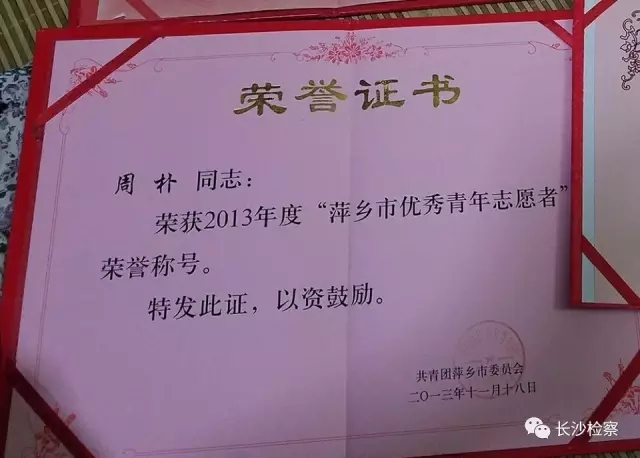 周朴因在志愿者活动中表现突出,2013年11月获共青团萍乡市委“2013年度优秀青年志愿者”荣誉称号。