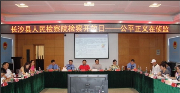 7月24日上午,岳麓区检察院举办了以“宣传检察工作职能,展示侦查监督风采”为主题的检察开放日活动,邀请了人大代表、政协委员、人民监督员、特约检察员、政法干警、律师、高校学生、社区群众以及网站版主、博主、网民等30多人观看优案视频、旁听逮捕案件的公开审查,座谈交流,了解检察机关侦查监督职能,零距离感受检察工作。