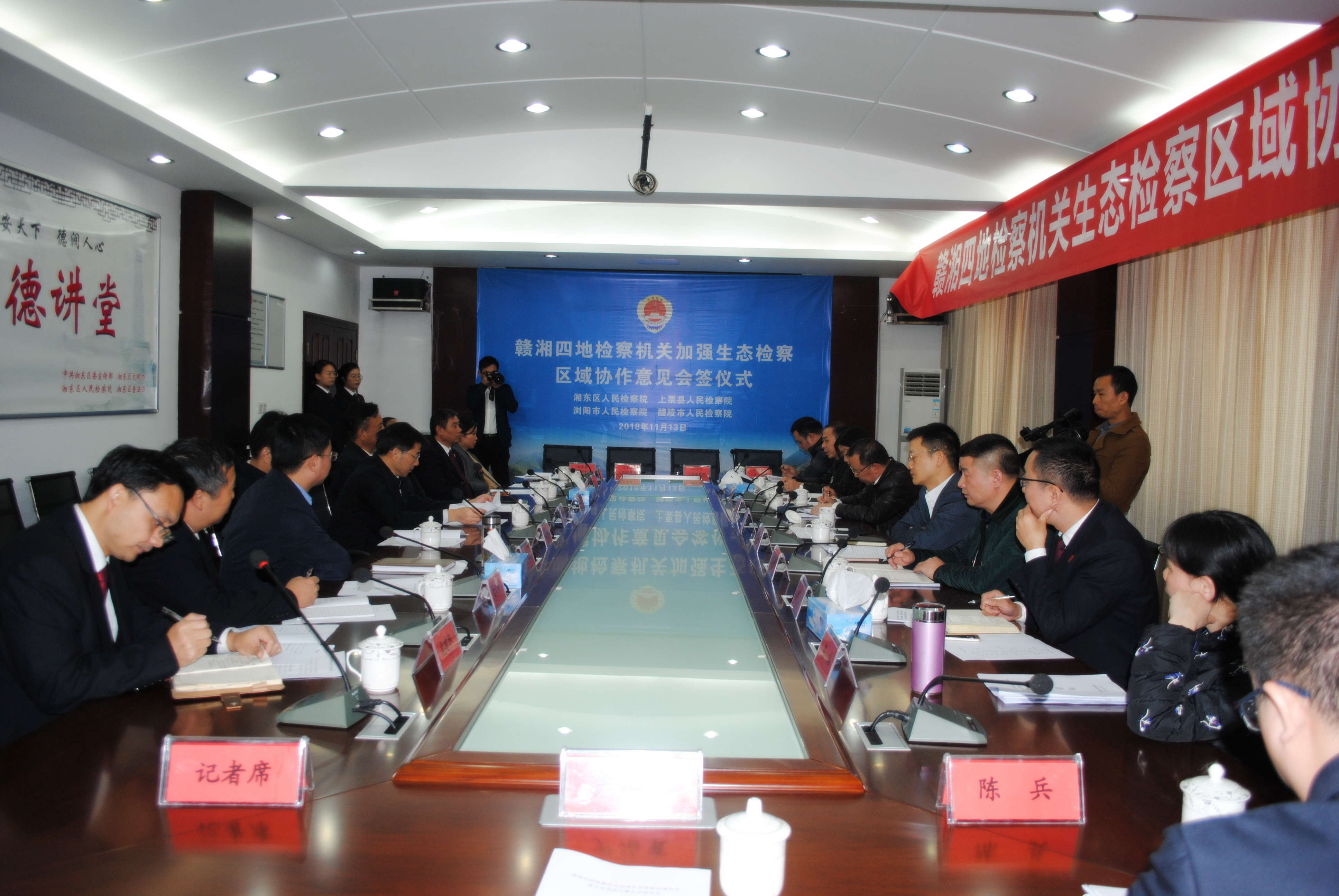 11月13日,为深化生态检察区域协作,促进形成生态保护合力,湘东、浏阳、上栗、醴陵四地检察机关在湘东区检察院联合签署了《关于加强生态检察区域协作的意见》(以下简称《意见》),并就生态检察工作特别是公益诉讼工作进行了交流座谈。长沙浏阳市人民检察院党组书记、检察长陈芳,醴陵市人民检察院党组书记、检察长黄晓军,上栗县人民检察院党组书记、检察长周波,湘东区人民检察院党组书记、检察长郭晓灵以及四地分管副检察长、民行检察部门负责人参加了会签仪式并座谈。萍乡市人民检察院燕晓华检察长、王萍实副检察长,湘东区委常委、政法委书记文亚萍出席会签仪式。