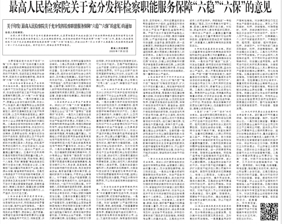 为深入学习贯彻习近平总书记重要讲话精神,认真贯彻落实中央政法委《关于依法保障和服务疫情防控常态化条件下经济社会发展的指导意见》,充分发挥检察职能,切实做好检察环节服务保障“六稳”“六保”工作,最高人民检察院制定了《关于充分发挥检察职能服务保障“六稳”“六保”的意见》,并经2020年7月21日第十三届最高人民检察院党组第一百一十九次会议通过。