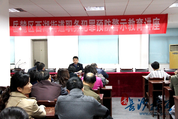 “现在全国检察机关正在开展查办涉农和扶贫职能部门、乡镇党政机关工作人员等农村基层组织人员的职务犯罪案,所以我们街道、社区干部一定不要碰触法律的红线,下面先来看一组发生在我们身边的职务犯罪案例……”10月29日-30日下午,湖南省长沙市岳麓区检察院职务犯罪预防科李丰科长应邀分别来到该区西湖、岳麓街道,为街道机关工作人员、社区干部200余人上了一堂精彩的预防职务犯罪警示教育课。