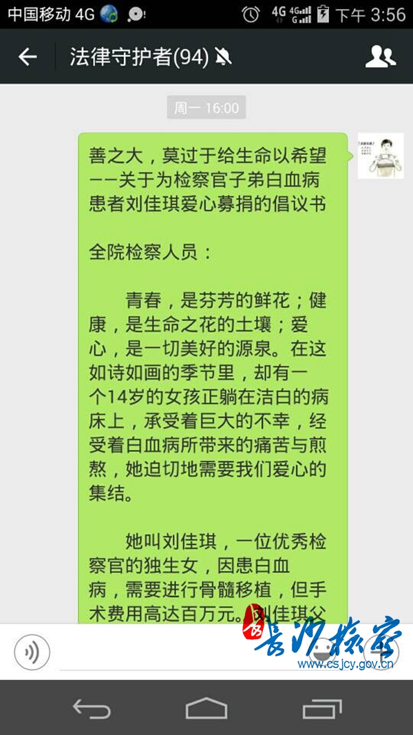 10月24日,星期六。在湖南省长沙县检察院的微信群中,出现了一条“救助小佳琪—— 湖北省仙桃市检察院检察官刘有道14岁女儿刘佳琪身患白血病,需要骨髓移植,目前配型成功,却无法支付百万元的手术及术后治疗费用,向社会求助”的信息,并附媒体报道链接。瞬间,群里炸开了锅,大家被这位优秀检察官和女儿与疾病抗争的事迹深深感动,纷纷希望能给予一份帮助,有的自发转账捐款,有的转发朋友圈呼吁……