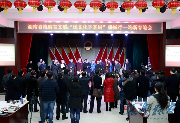 1月25日,窗外瑞雪飘飞,室内喜气洋洋,湖南省检察官文联“送文化下基层”迎新春笔会活动正在望城区检察院如火如荼地进行着。