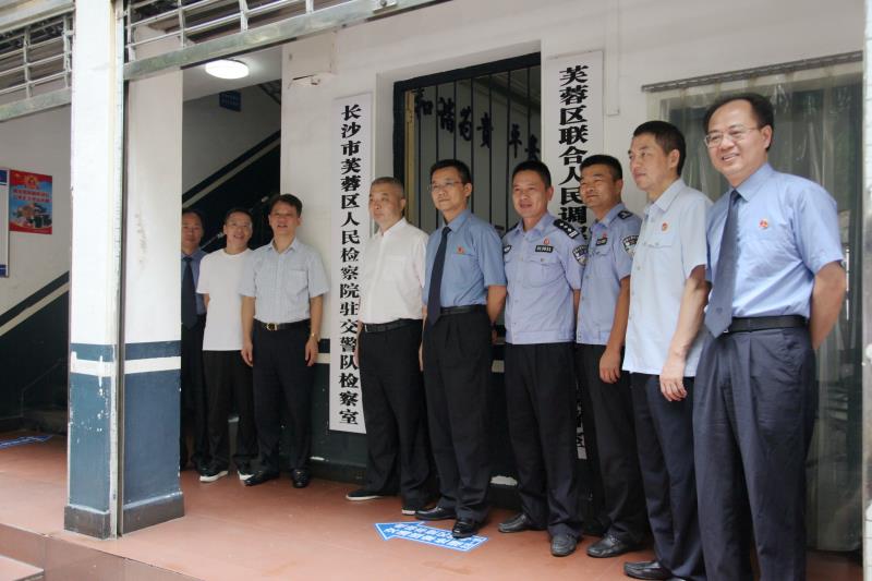 8月15日,长沙市芙蓉区人民检察院驻区交警大队检察室成立揭牌仪式暨交通肇事和危险驾驶刑事案件依法快速办理工作座谈会在区交警大队举行。省检察院侦监一处处长张龙,芙蓉区委常委、政法委书记刘文立为检察室揭牌。