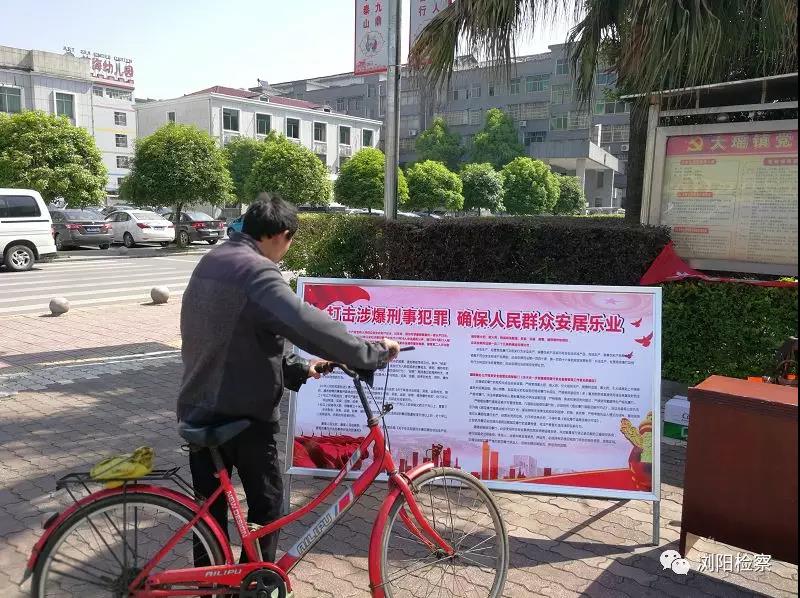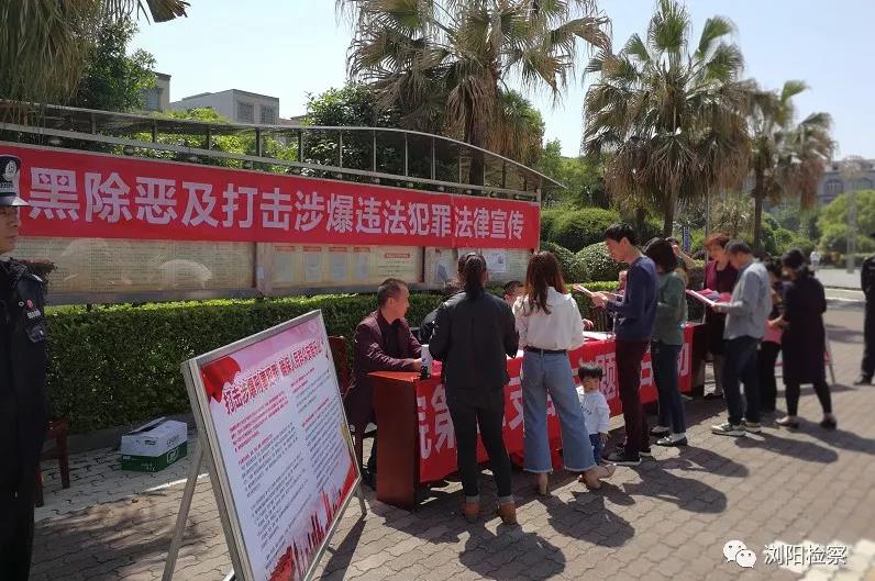 4月18日,浏阳市人民检察院侦监、控申、监所、监察等部门干警,联合大瑶镇政府、公安等相关部门,在大瑶镇百姓广场开展“扫黑除恶、打击涉爆刑事犯罪,确保人民安居乐业”为主题的法治宣传活动,拉开浏阳市人民检察院在浏阳市乡镇开展“扫黑除恶”巡回法治宣传的序幕。