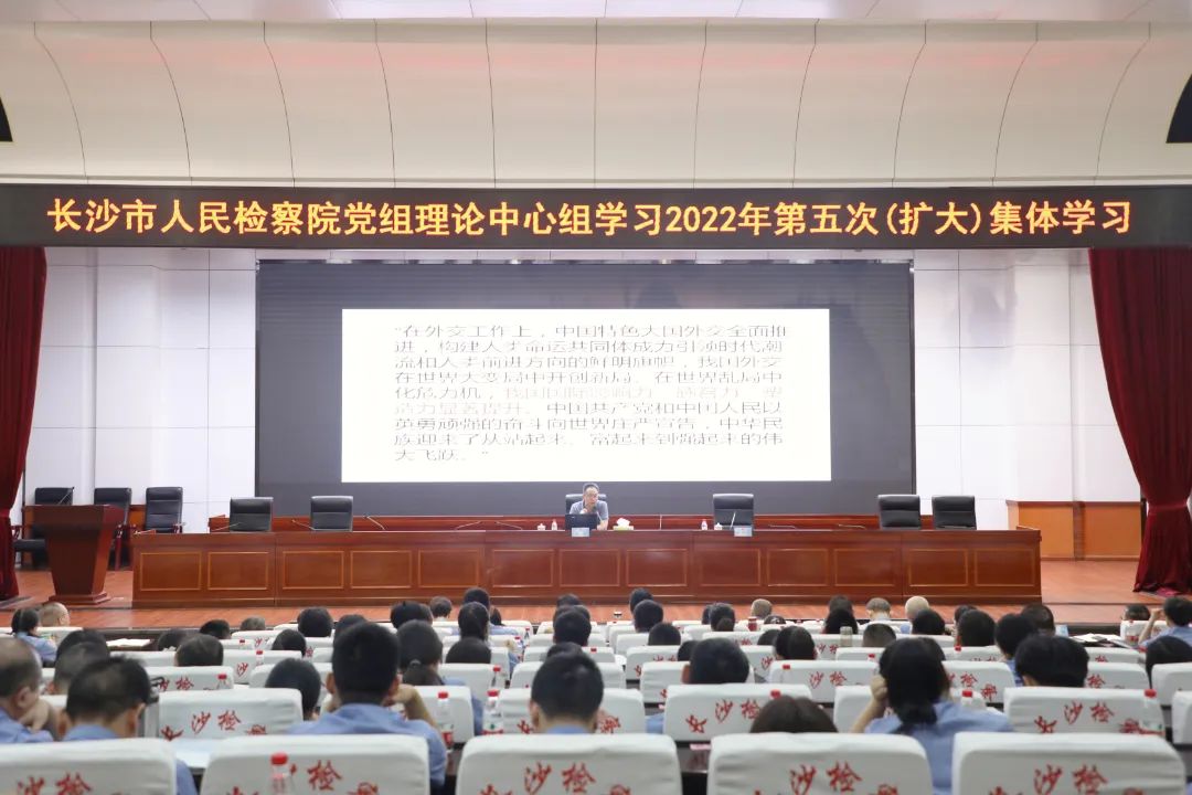 举行党组理论学习中心组第五次集体(扩大)学习,邀请湖南师范大学公共管理学院教授万丹作《国际形势与热点分析——从中国特色大国外交来看》专题辅导,市检察院党组书记、检察长余湘文主持。市检察院、星城院全体检察干警参加。