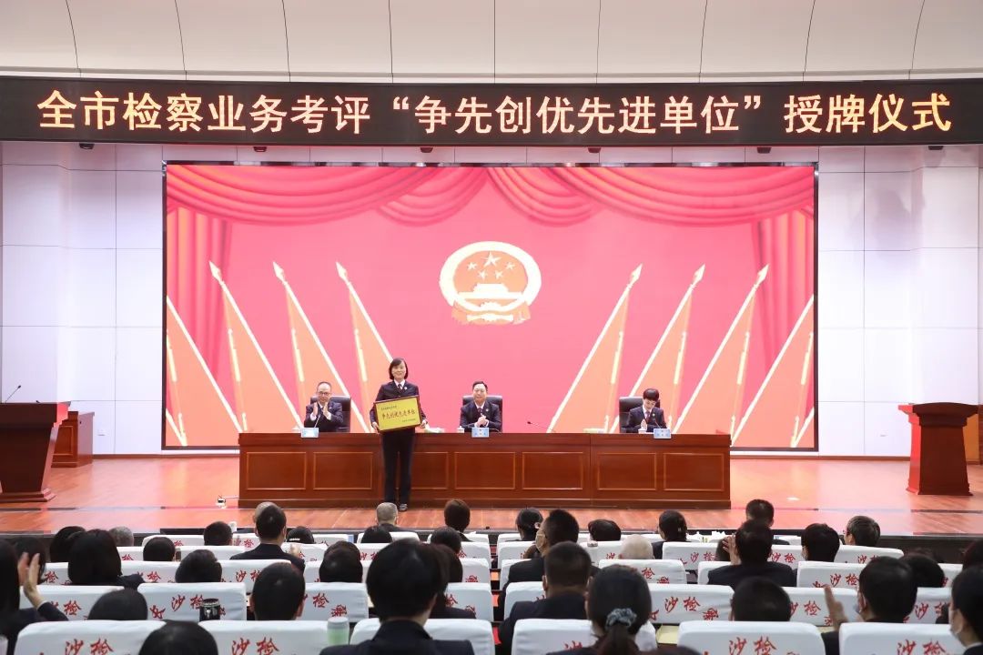 余湘文为连续三个月在市检察院检察业务考评排名前三名的第九检察部授予了“争先创优先进单位”奖牌,第九检察部主任张佳莉上台做经验发言。