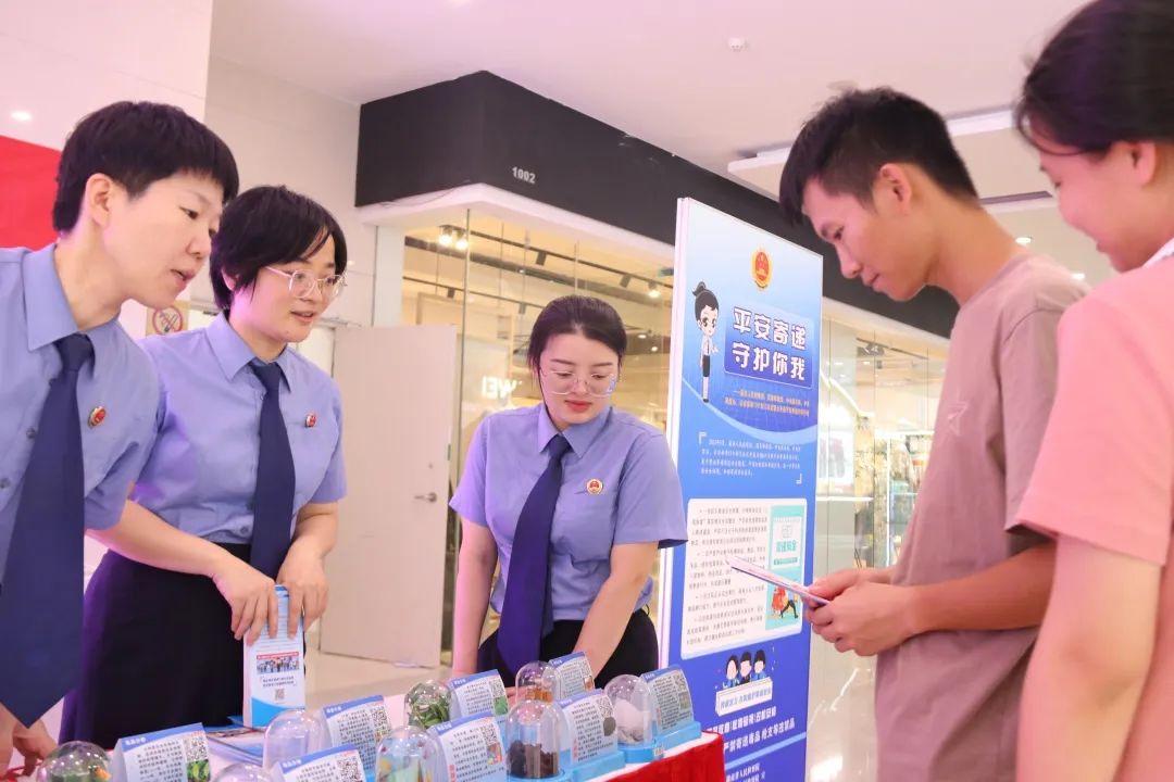 6月26日,在岳麓区银盆岭万达广场,三级检察院的干警通过张贴“禁毒路上 一路有你”“绿色无毒 健康人生”禁毒宣传标语、摆放新型毒品宣传展板和毒品仿真模型,并在商场户外电子屏幕上播放禁毒宣传公益视频,向往来的外卖员、快递员、游客和社会群众发放禁毒宣传资料,提供禁毒和寄递法律咨询。本次专项宣传活动中,省市区三级检察院共发放宣传资料300余份,摆放禁毒宣传展板5块,播放禁毒公益视频宣传片2.5小时,现场参与受众300人次。