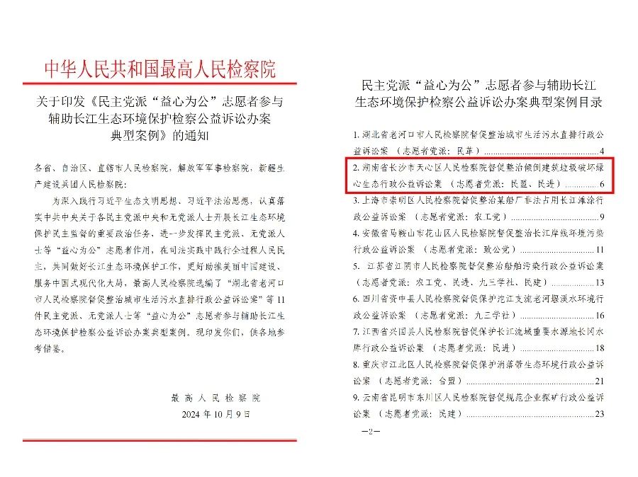 近日,最高人民检察院发布《民主党派“益心为公”志愿者参与辅助长江生态环境保护检察公益诉讼办案典型案例》,湖南省长沙市天心区人民检察院督促整治倾倒建筑垃圾破坏绿心生态行政公益诉讼案成功入选。