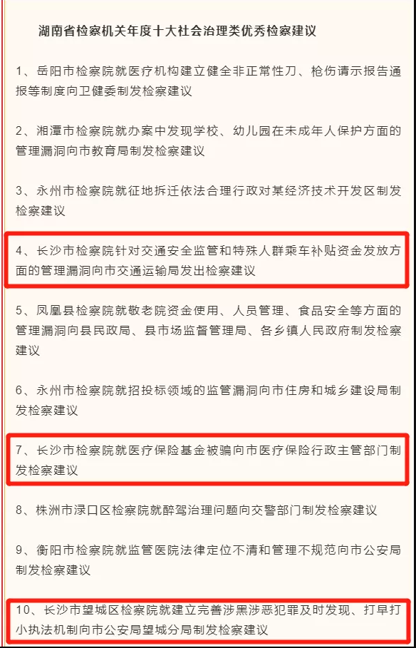 1月19日,湖南省检察院召开新闻发布会,发布全省检察机关年度10大社会治理类优秀检察建议,其中,长沙检察机关发出的检察建议占了3席。长沙检察机关发出的这些检察建议,有效推动了交通安全整治、堵塞交通安全管理漏洞、完善交通运输管理机制;有效推动了医保基金使用更加安全,守护好老百姓看病的“钱袋子”;推动完善了扫黑除恶长效治理机制。