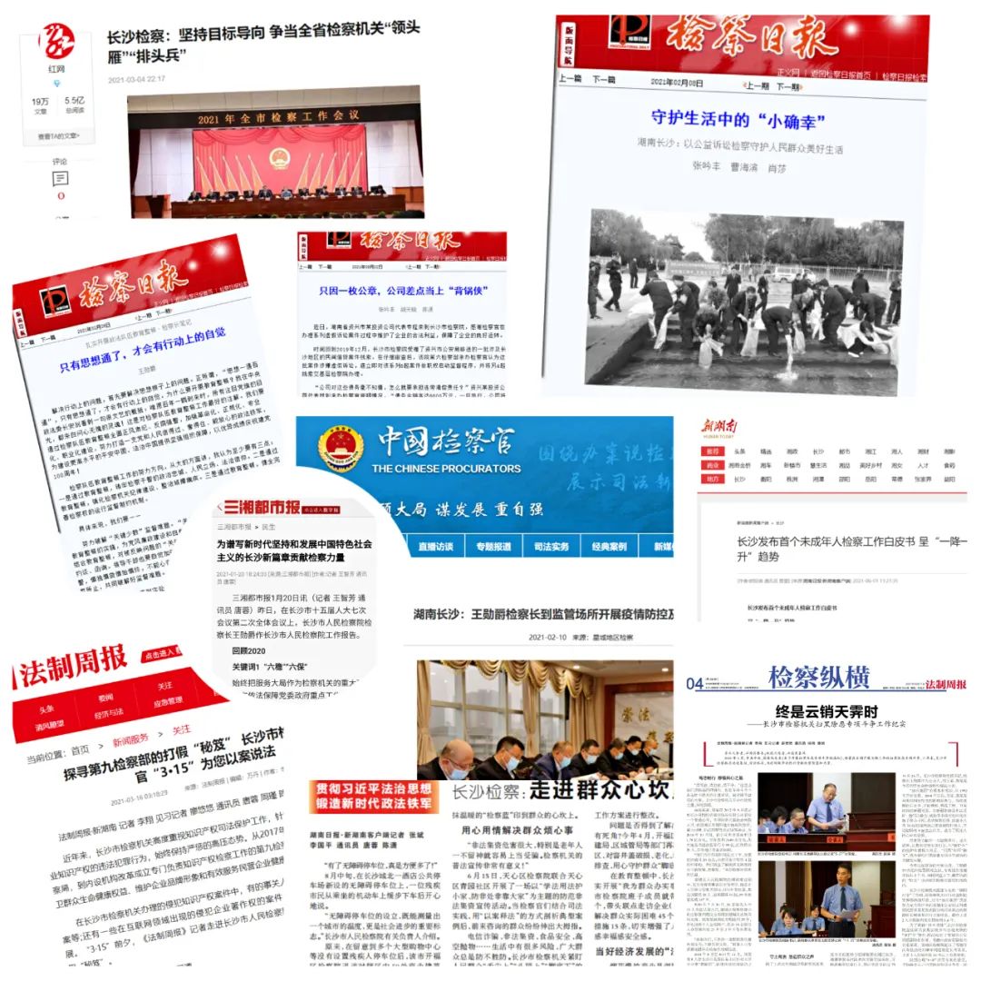 近年来,长沙市检察机关坚持检察工作为本、检察文化为要、新闻宣传为效“三位一体”宣传工作理念,紧紧围绕检察中心工作,充分借助《检察日报》等主流媒体平台,融合多种方式,纵深推进法治宣传工作。推出了一批高质量的新闻作品,先后开设长检匠心、长检“1”分钟、身边的榜样、检察为民办实事等系列专栏,立足检察工作新实践,讲述检察好故事,传播法治正能量,取得了较好的宣传效果,受到广泛好评。今年以来,全市检察机关在市级及以上媒体发表稿件两千余篇,其中多个普法小视频、为民办实事报道得到中央、省、市级媒体的大力推介。