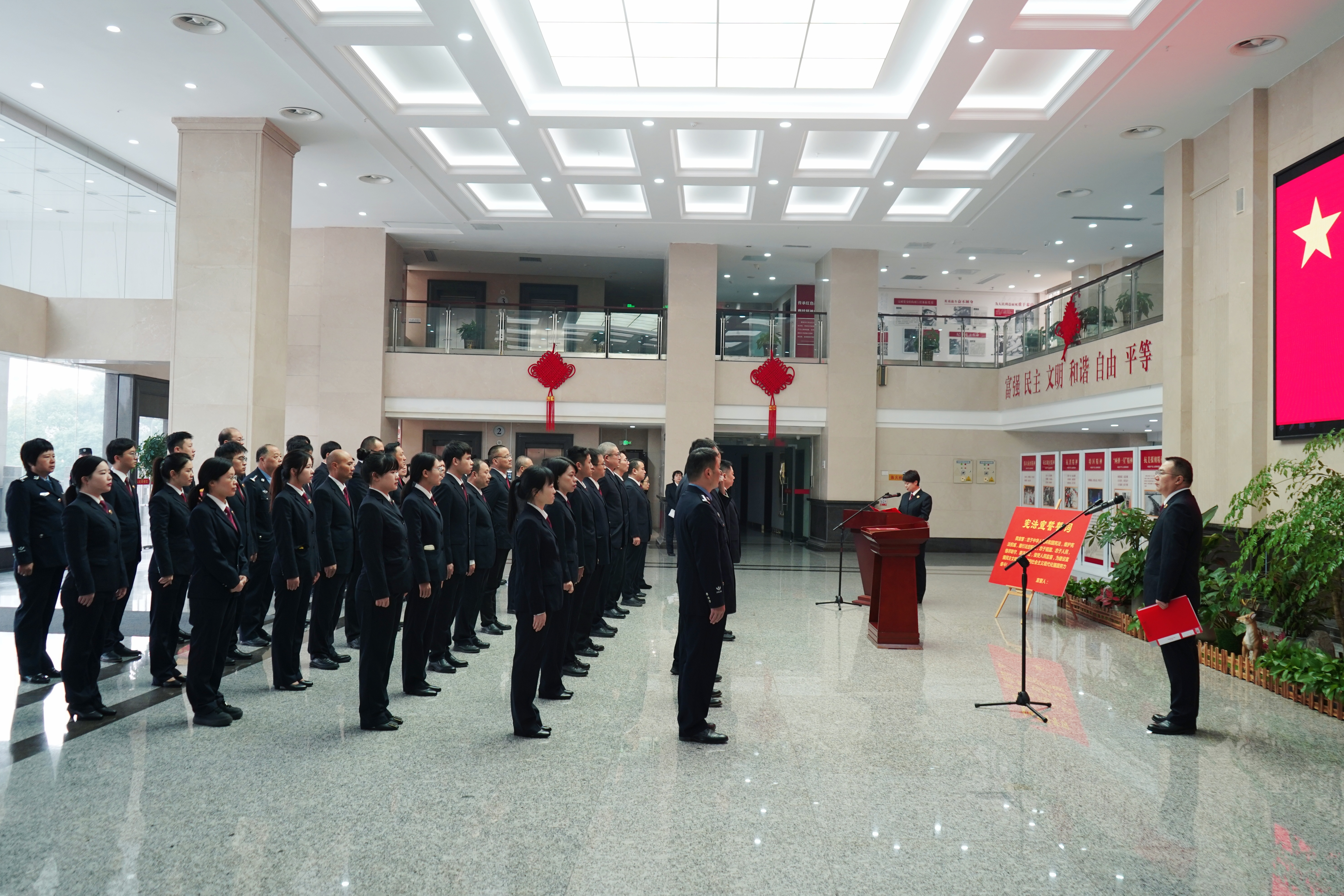 在庄严的国歌声中,宣誓仪式拉开了序幕。领誓人左手抚按《中华人民共和国宪法》,领诵誓词,宣誓人员紧随其后,右手举拳,拳心朝前,跟诵誓词,声音坚定而有力,彰显了检察人员对宪法的忠诚与誓言的庄严。