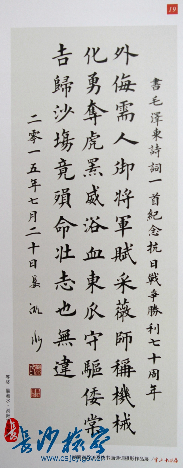 近日,湖南省政法系统书画诗词研究会发布通报,全省政法系统纪念中国人民抗日战争暨世界反法西斯战争胜利70周年书画诗词摄影作品展评选揭晓。浏阳市人民检察院干警晏湘水选送的一件书法类参展作品荣获一等奖。
