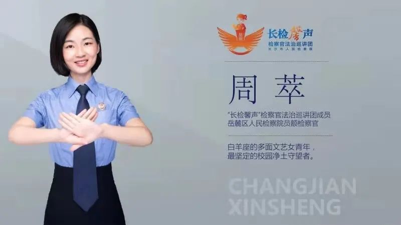 周萃,女,85后,在职研究生学历,2011年7月通过公开招考进入湖南省常德市澧县检察院,2015年8月经选调至湖南省长沙市岳麓区检察院,现任长沙市岳麓区检察院第一检察部副主任,未检专干。多次被评为“岳麓区优秀公务员”、获得“嘉奖”,荣获2020年年度“湖南省优秀女检察官提名奖”、最高检“法治进校园”全国巡讲活动表现突出个人。