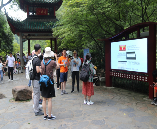 室外宣传展示区位于爱晚亭广场,通过设置的两块室外全彩高清显示屏,滚动播出检察公益诉讼宣传片和微视频,供游客自由观看,以提升公益诉讼检察工作的社会知晓度,引导社会公众积极参与公益诉讼。