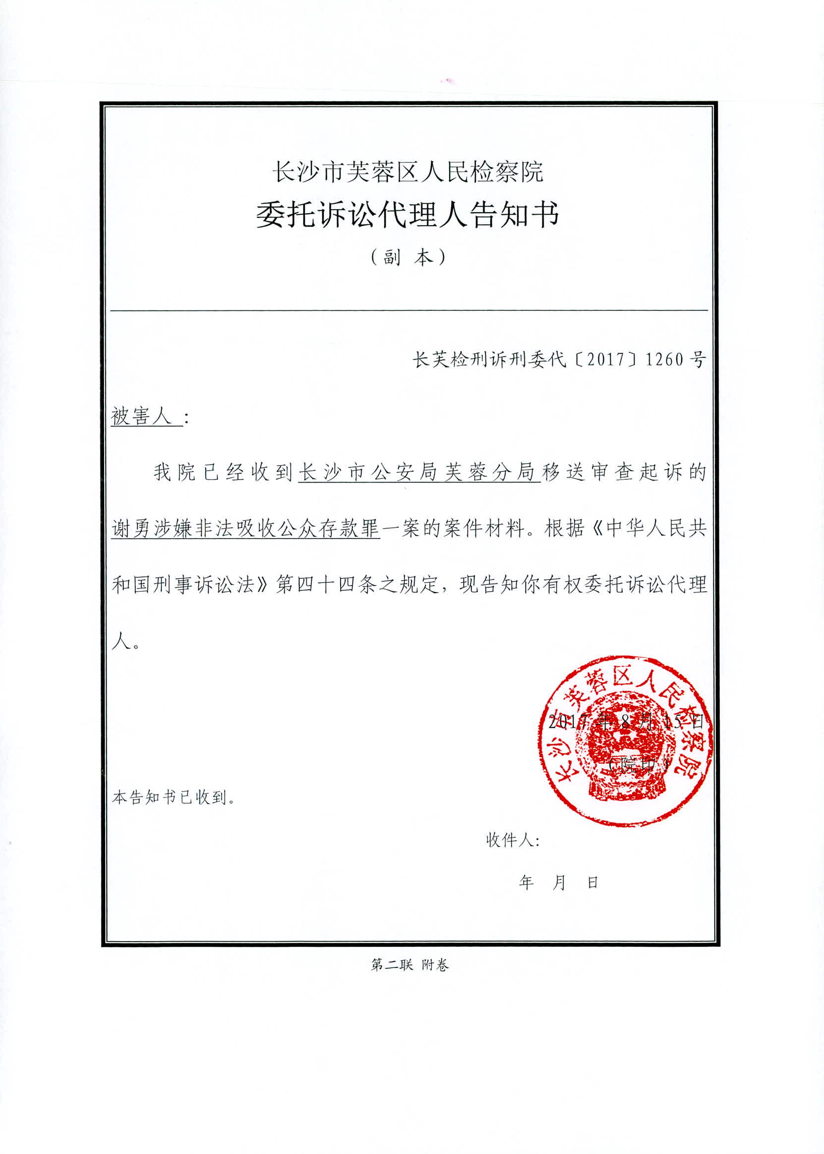 谢勇涉嫌非法吸收公众存款案权利义务告知书