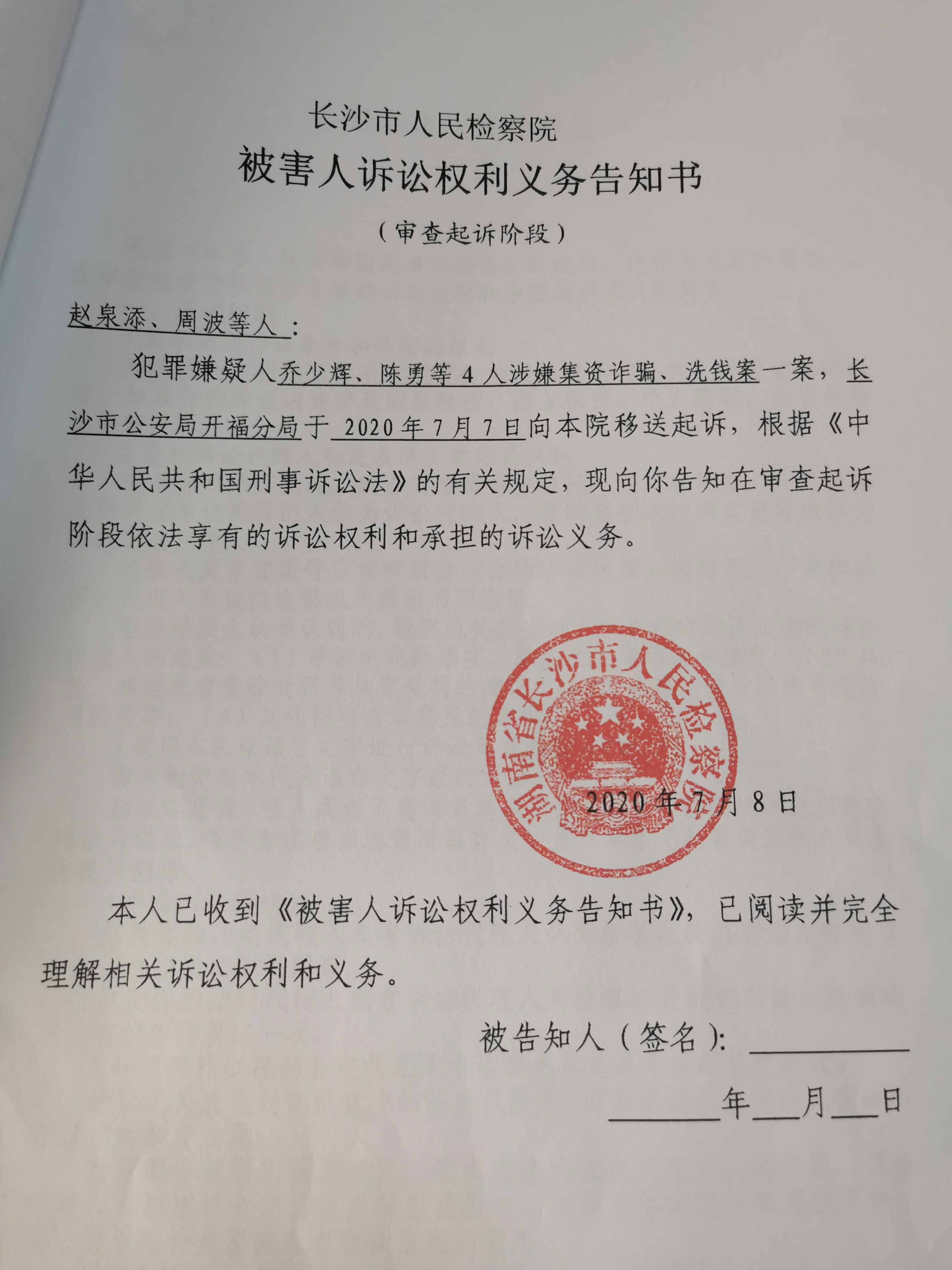 犯罪嫌疑人乔少辉、陈勇等4人涉嫌集资诈骗、洗钱案被害人诉讼权利义务告知书