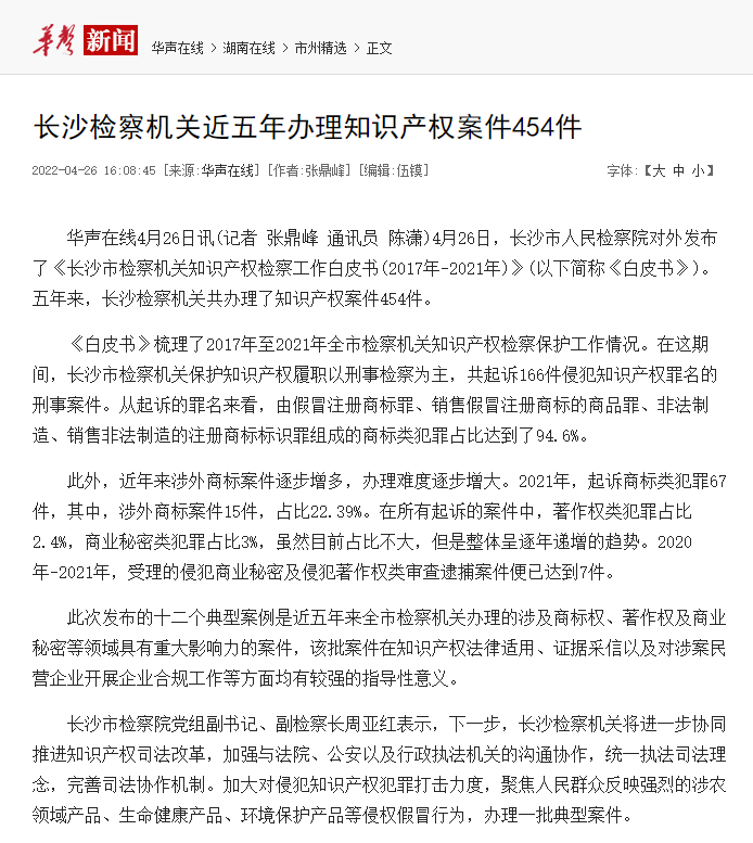 4月26日,91风流 召开长沙检察知识产权司法保护状况新闻发布会,向社会发布《长沙市检察机关知识产权检察工作白皮书(2017年-2021年)》及《长沙市检察机关知识产权检察典型案例(2017年-2021年)》。