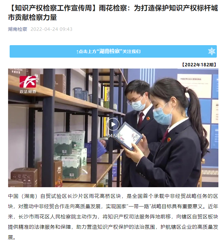 从4月21日至4月26日,长沙检察机关联合长沙政法频道推出“服务经济发展,护航创新驱动”为主题的“长检匠心”系列节目,分别以《对焦中非贸易,保护跨国交易知识产权》(雨花区)、《擦亮城市名片,保护食品安全》(天心区)、《护航自贸区经济发展,保护商业秘密》(长沙县)、《助力企业发展,服务智能制造》(岳麓区)、《加强文化领域知识产权保护,保护数字媒体艺术创新》(开福区)和《加强种业知识产权保护,确保粮食安全》(芙蓉区)共6个专题,对全市6个基层院相关工作开展情况进行特别报道,充分展现了长沙市检察机关贯彻落实“强省会”战略,助力知识产权标杆城市建设的担当。